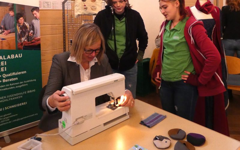 In diesem Jahr repräsentierten die Schneiderinnen unseren Stand bei der BAM und bewarben die Ausbildungsberufe der Jugendwerkstatt Langenaltheim gGmbH. Bei einer kleinen Mitmachaktion konnten die Besucher ausprobieren, wie an einer Nähmaschine gearbeitet wird. Besonders spannend war es, als die Bürgermeisterin Dr. Dr. Becker ein kleines Täschchen unter der fachkundigen Anleitung der zwei Azubis fertigte.